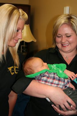 At that moment I closed my eyes and did not open them until after Wade was born. I can't explain why, but I had to shut it out and focus on keeping it together! I barely made it! Dr. Tran came in and talked to me and through my tears I told her I was fine with the c-section and to please please hurry to get him out and me out of pain! Alyssa had promised that she would be there to help me have the baby but of course that is before we knew that our progress would come to a hault! The new nurse, Jamie, and Dr. Tran worked fast and furiously to get me ready for the OR. I was surprised that Dr. Tran was doing the nurse's duties but later found out that labor and delivery had been slammed all evening and they were short handed. They wheeled me into the bright OR and as soon as I met the anesthesiologist I begged for more meds! He gave me all he had and we got started soon after. Justin was rushed into the room just seconds after the first incision was made. He sat beside me holding my hand and come to find out, watched the whole thing! I must say, I don't have anything positive to say about the surgery except that it was quick! I felt everything but none of it hurt. Justin backed me up and told me I was right that they were flinging my organs around! I also felt some jerking tugs which I think Dr. Tran had to do in order to dislodge Wade's head from the pelvis. Ouch! We heard cries a short time later---Wade was here at 8:06pm! Then we heard, "Oh my word, he is huge!" "Giant baby" "Enormous!" Dr. Tran held him up for us to see him but I couldn't see over the screen. They took Justin back to the nursery with Wade so that he could be there for the footprints, bath, etc... While Dr. Tran was sewing me up Justin brought Wade back in all swaddled up for me to see him. Justin wasn't able to tip him forward far enough for me to see more than his forehead and eyes. I wanted to hold him so bad! They wheeled me back into the labor and delivery room where I stayed for the next 45 minutes. They were the worst 45 minutes of the day! I knew that everyone else was getting see Wade and I hadn't even officially met or touched him yet! Not fair! Finally, Justin brought him in and it was the sweetest moment of my life. My boy! He was perfect and so alert. We finished making calls and letting everyone know that he was here and all was well.